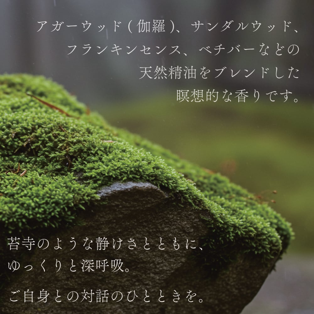 セットの苔ディフューザーに数滴垂らして、五感でお楽しみください。