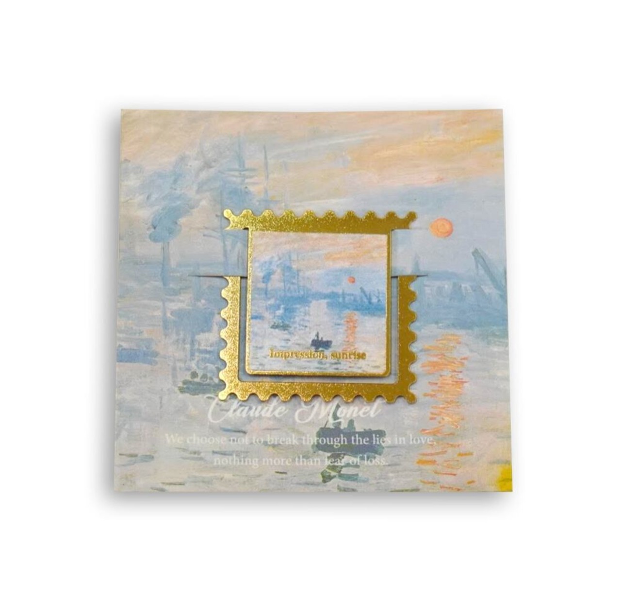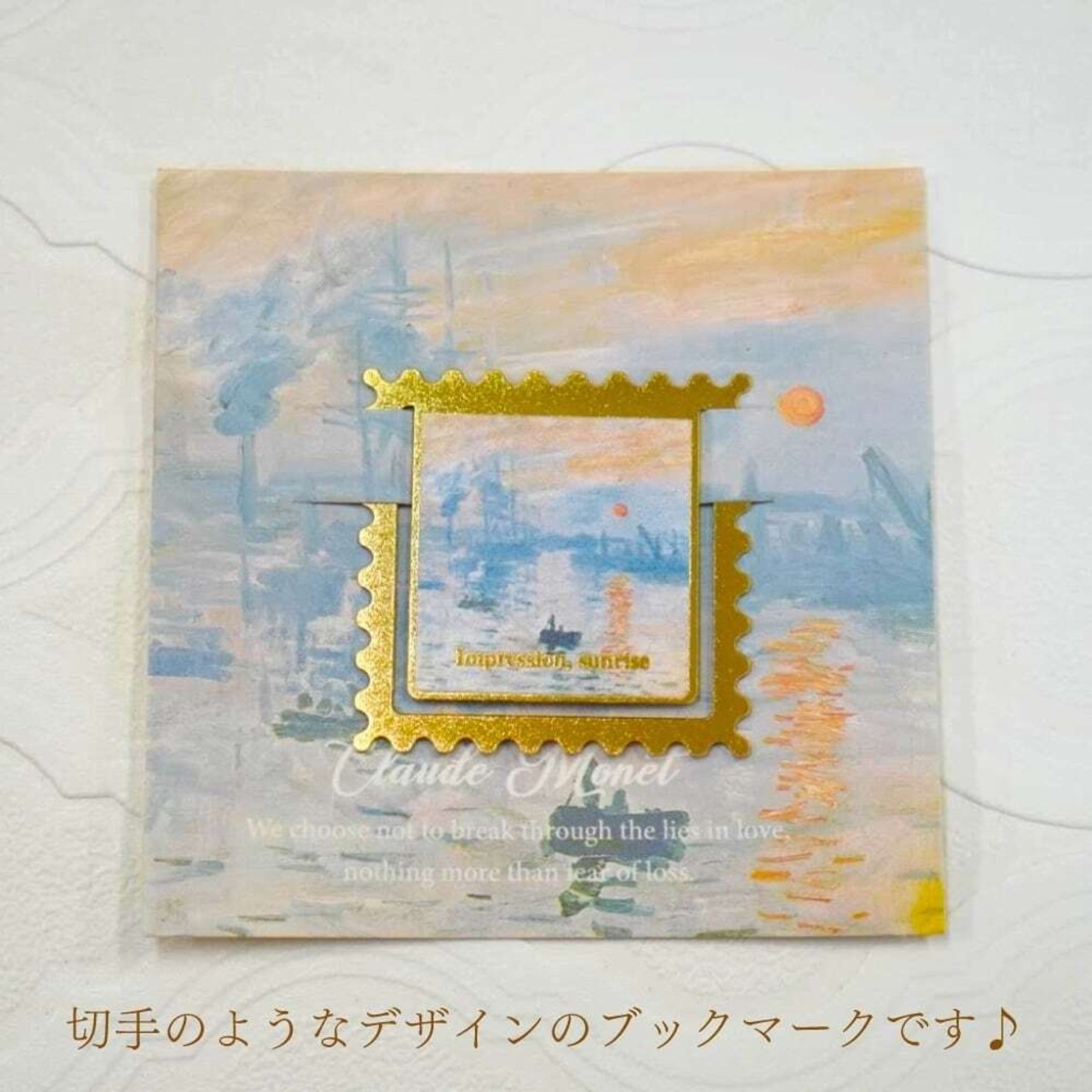 印象派を代表するフランスの画家、クロード・モネの代表作《印象・日の出》という作品の絵画をモチーフにした、ゴールドのフレームが美しい切手型ブックマークです。