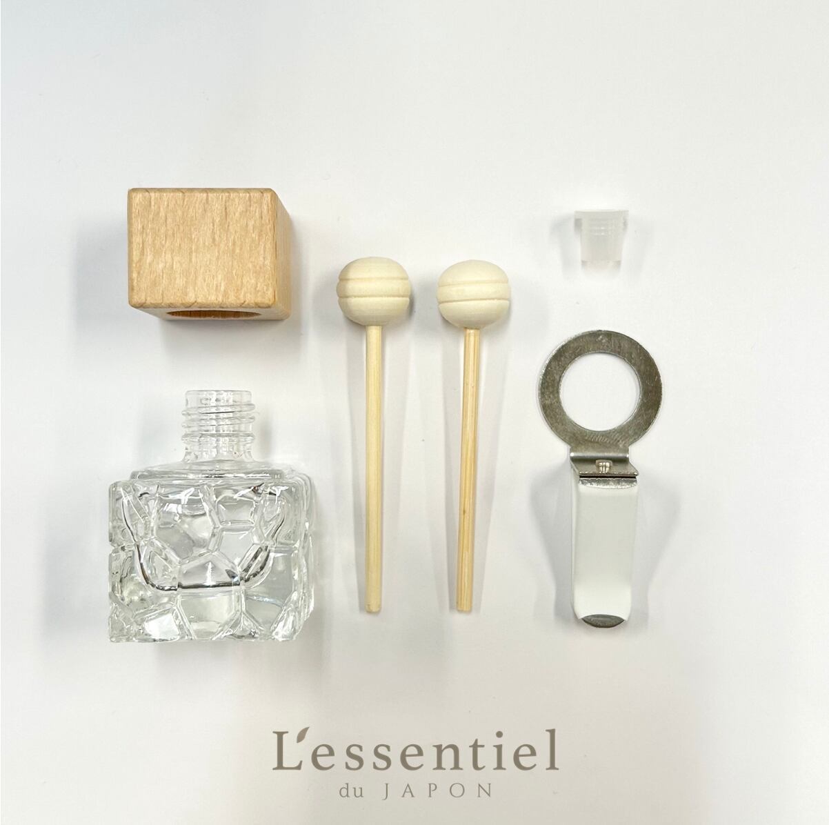 木製キャップ、詰替ガラスボトル、リードスティック2本、クリップ、中蓋
