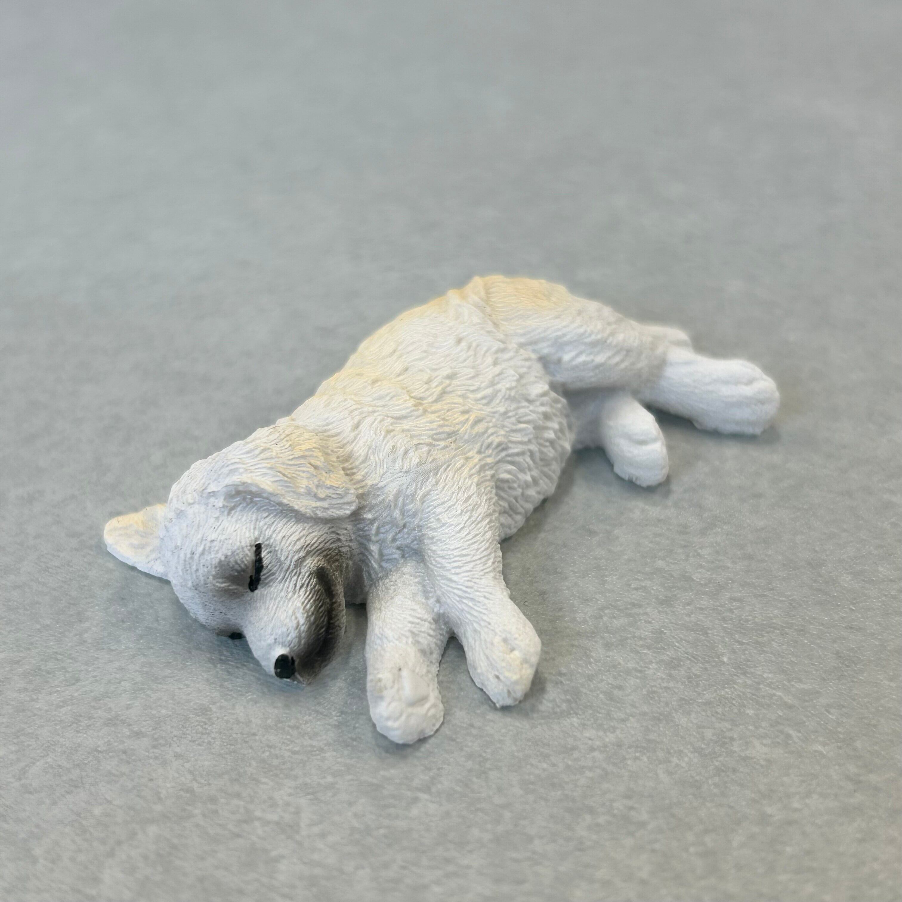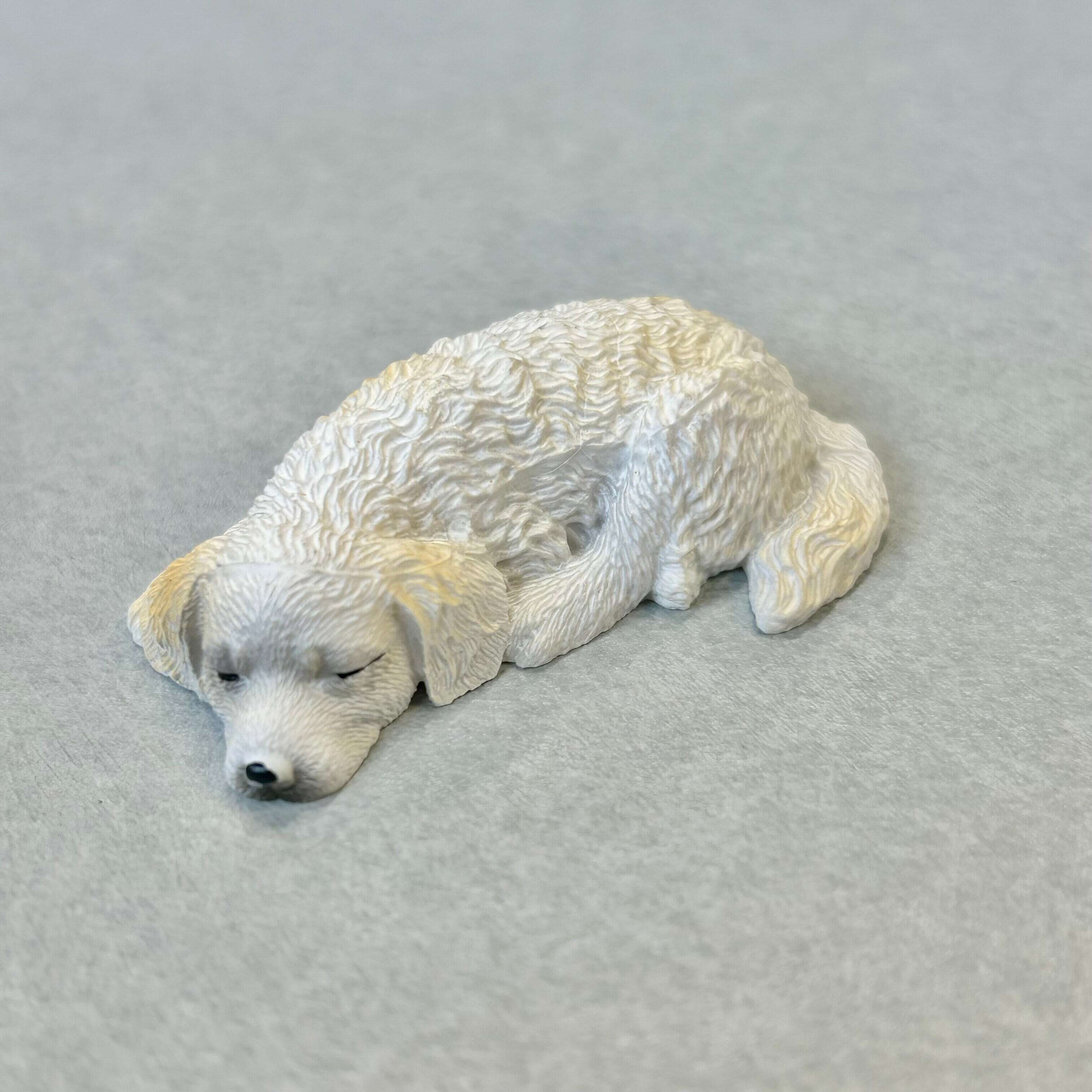 まるで本当に眠っているかのような、立体的でリアルなデザインが特徴の愛らしい犬の置物です。