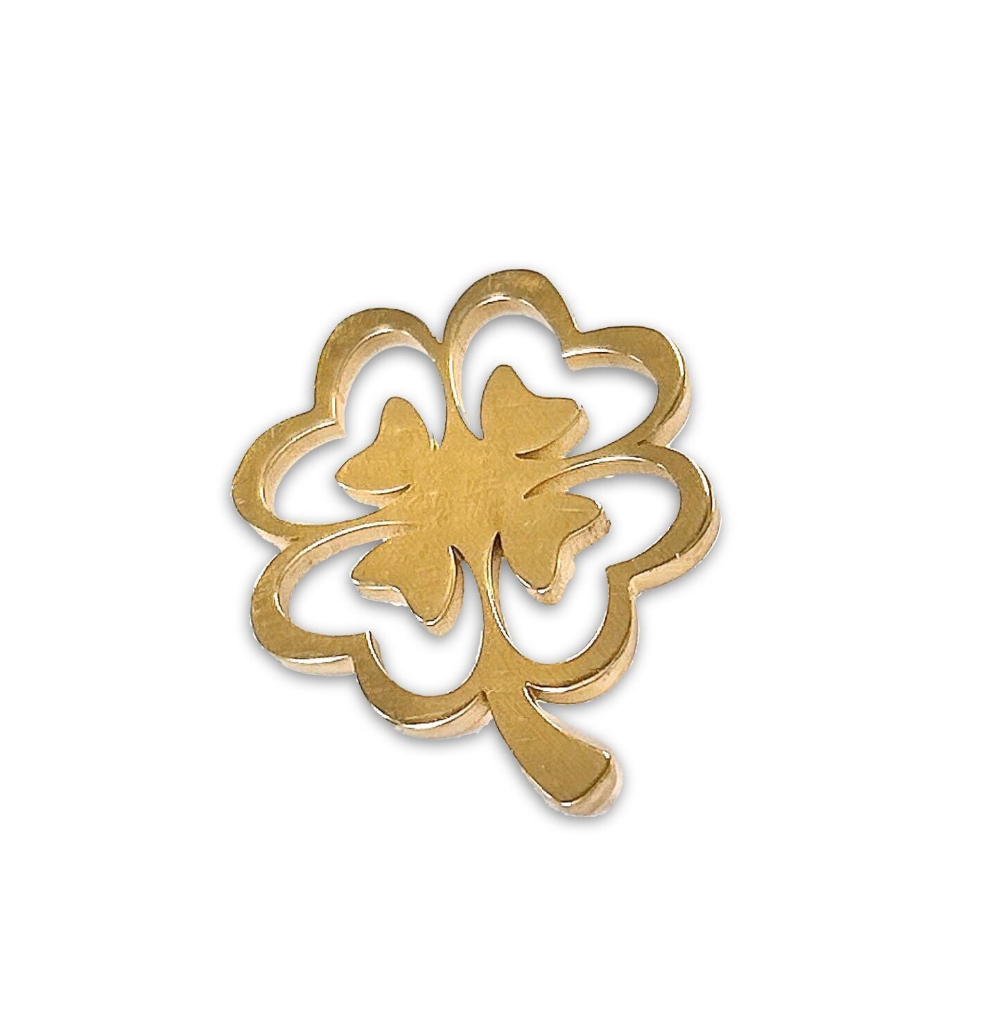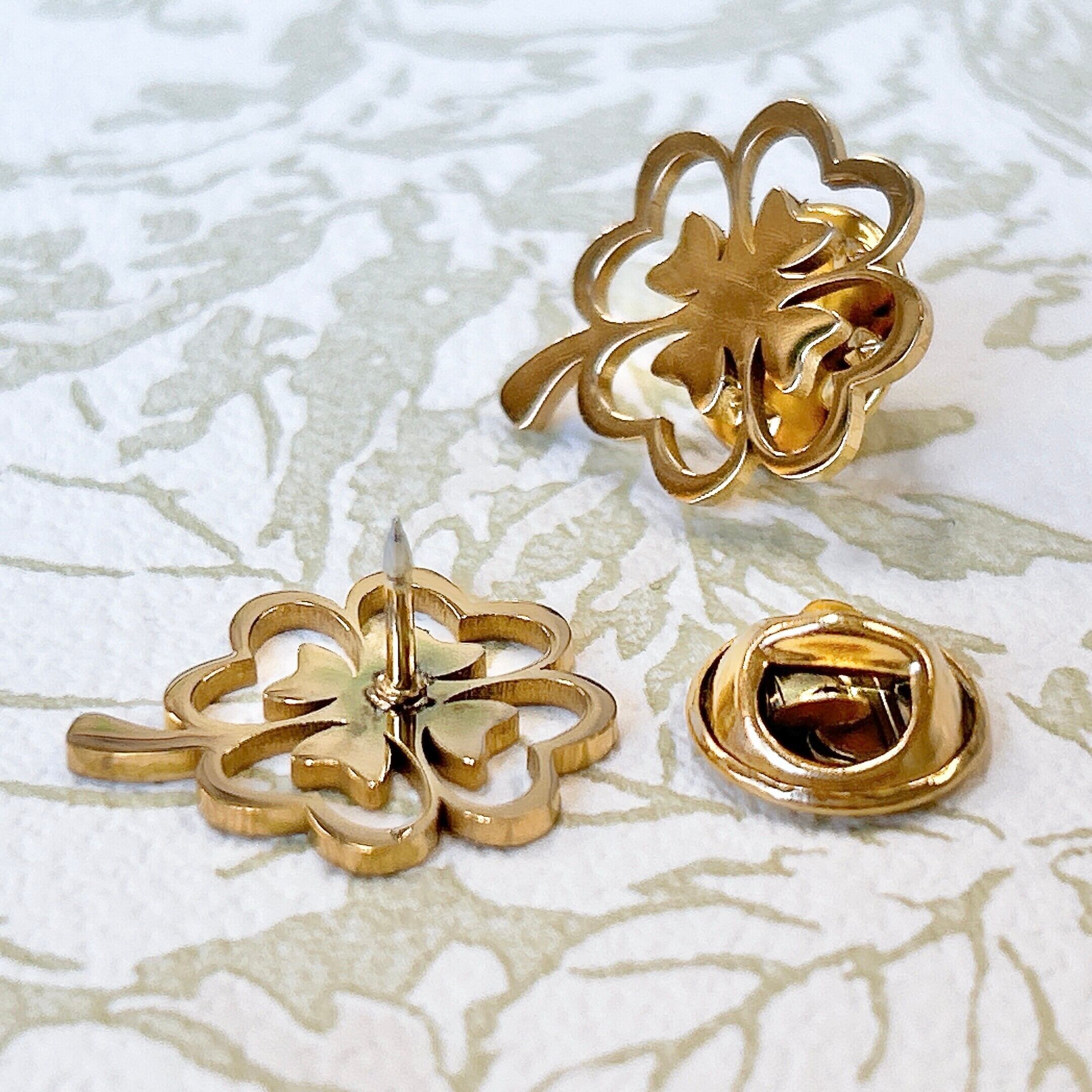 この二重クローバーピンバッジは、ゴールドの輝きが華やかさをプラスし、