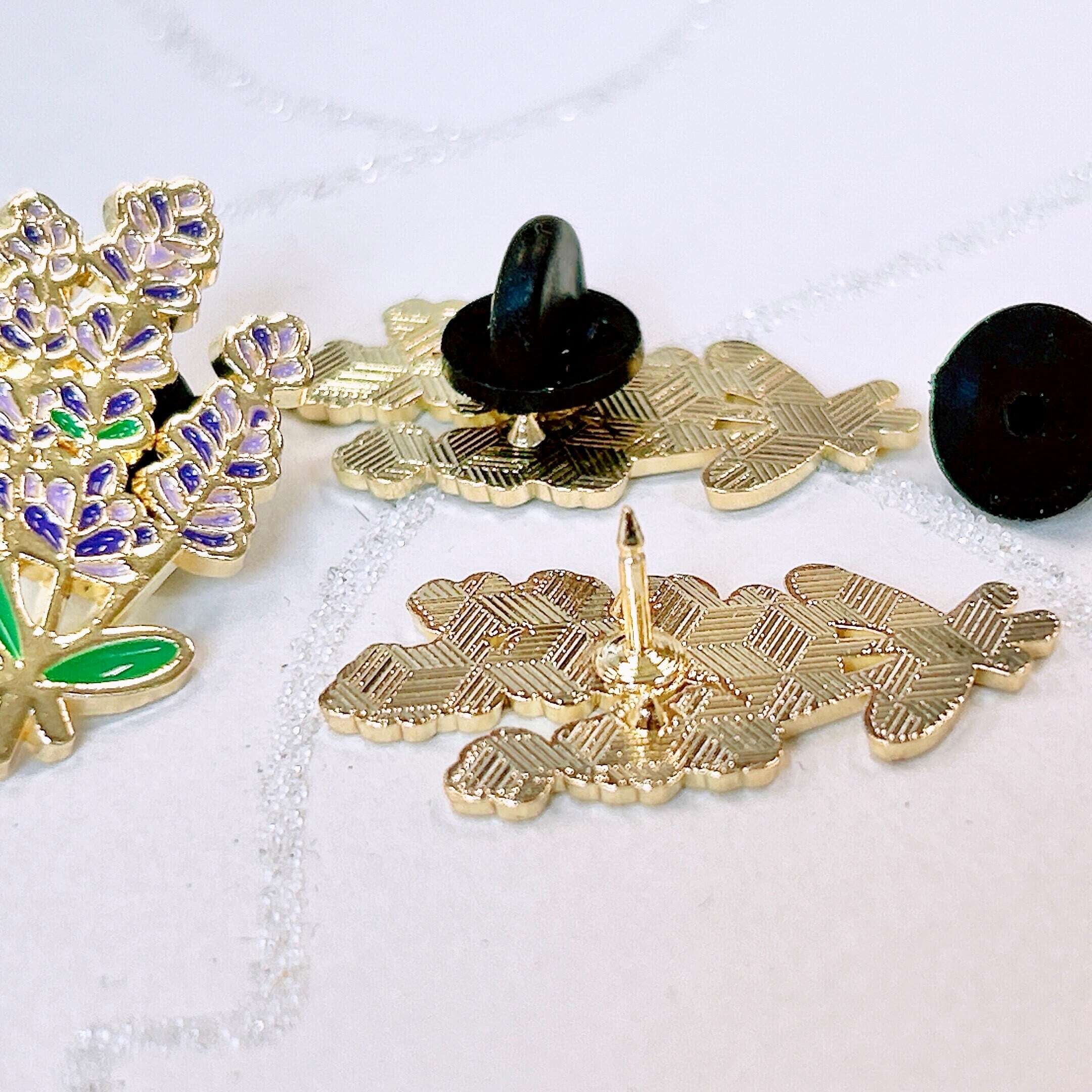 美しいゴールドで仕上げられた、可憐なラベンダーデザインのピンバッジです。