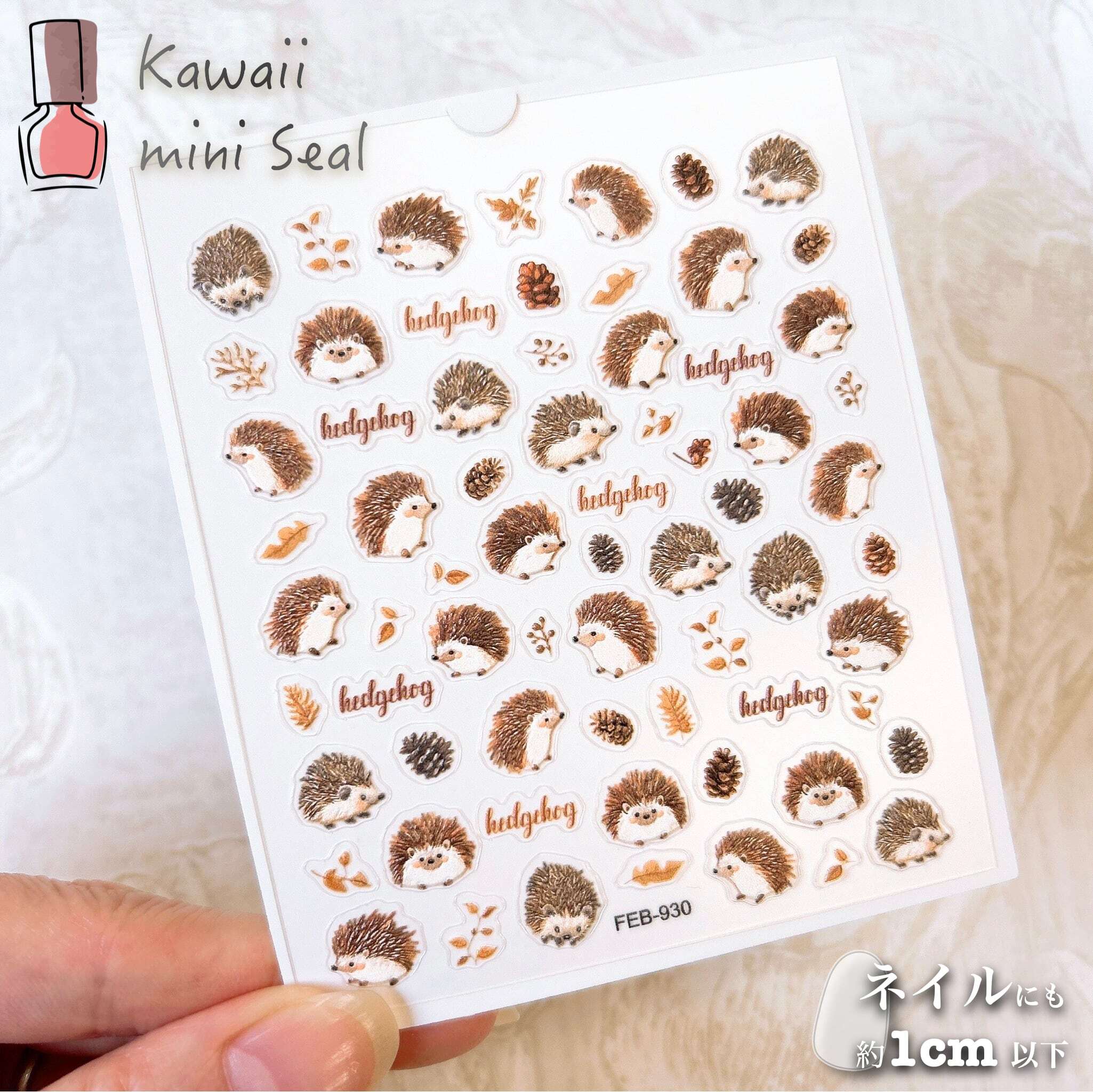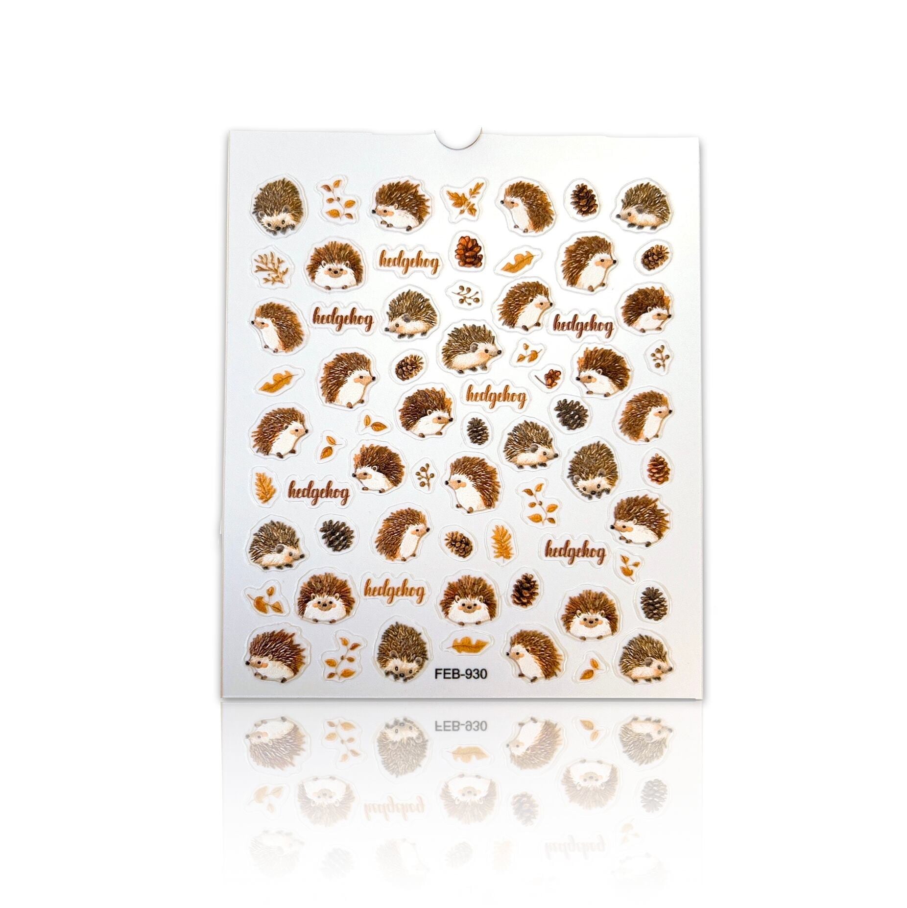 このネイルシールは、ハリネズミや松ぼっくり、葉っぱなどのデザインが揃っており、