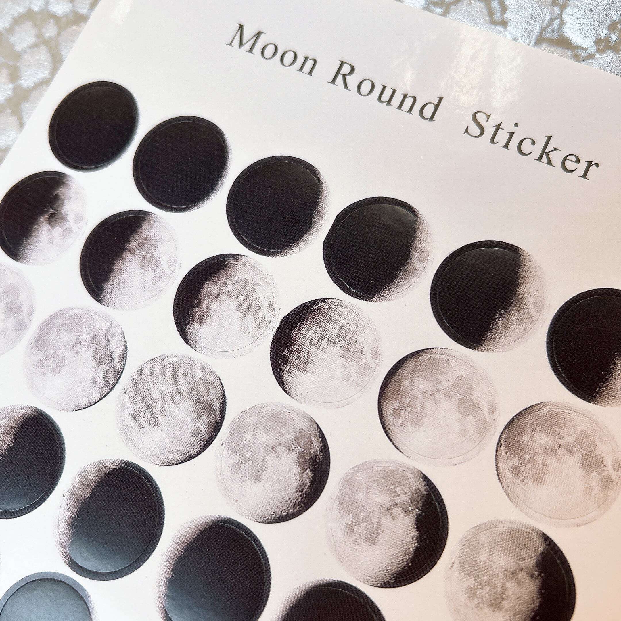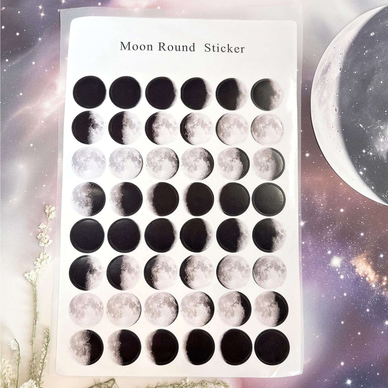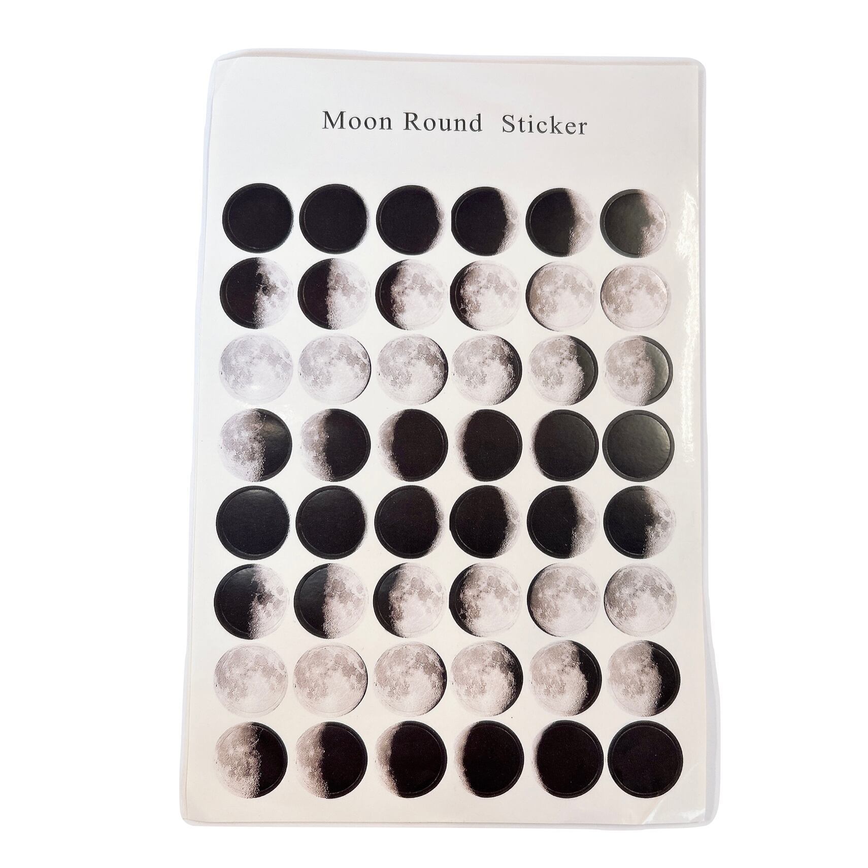 【 ムーン ラウンド ステッカー 】48枚×2シート 月 満ち欠け 惑星 宇宙 銀河 プラネット 満月 新月 スピリチュアル シール 文具 装飾 パーツ 素材 カレンダー デコレーション インテリア おしゃれ モノトーン シール帳 シール交換 雑貨 デスク アイテム 文具 文房具
