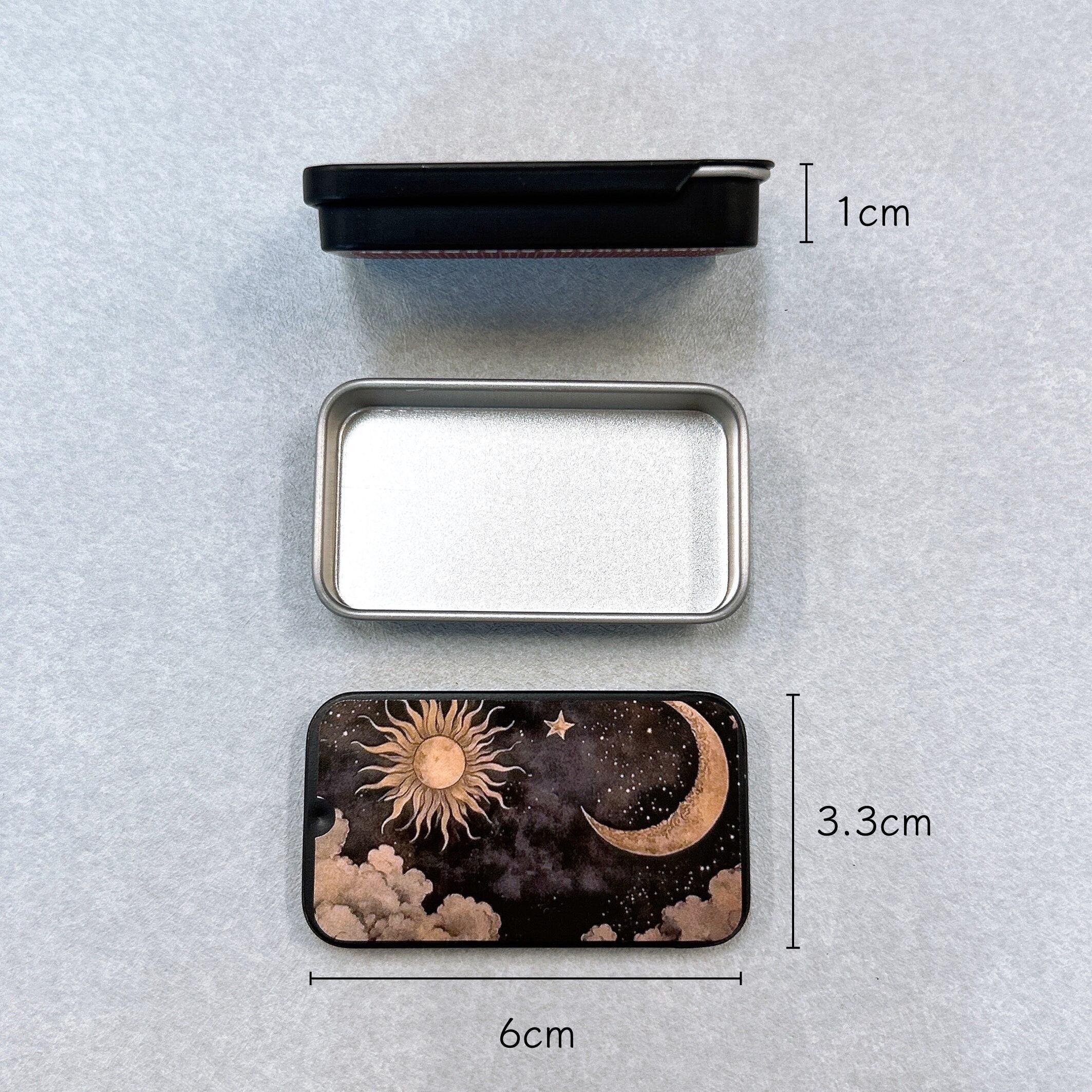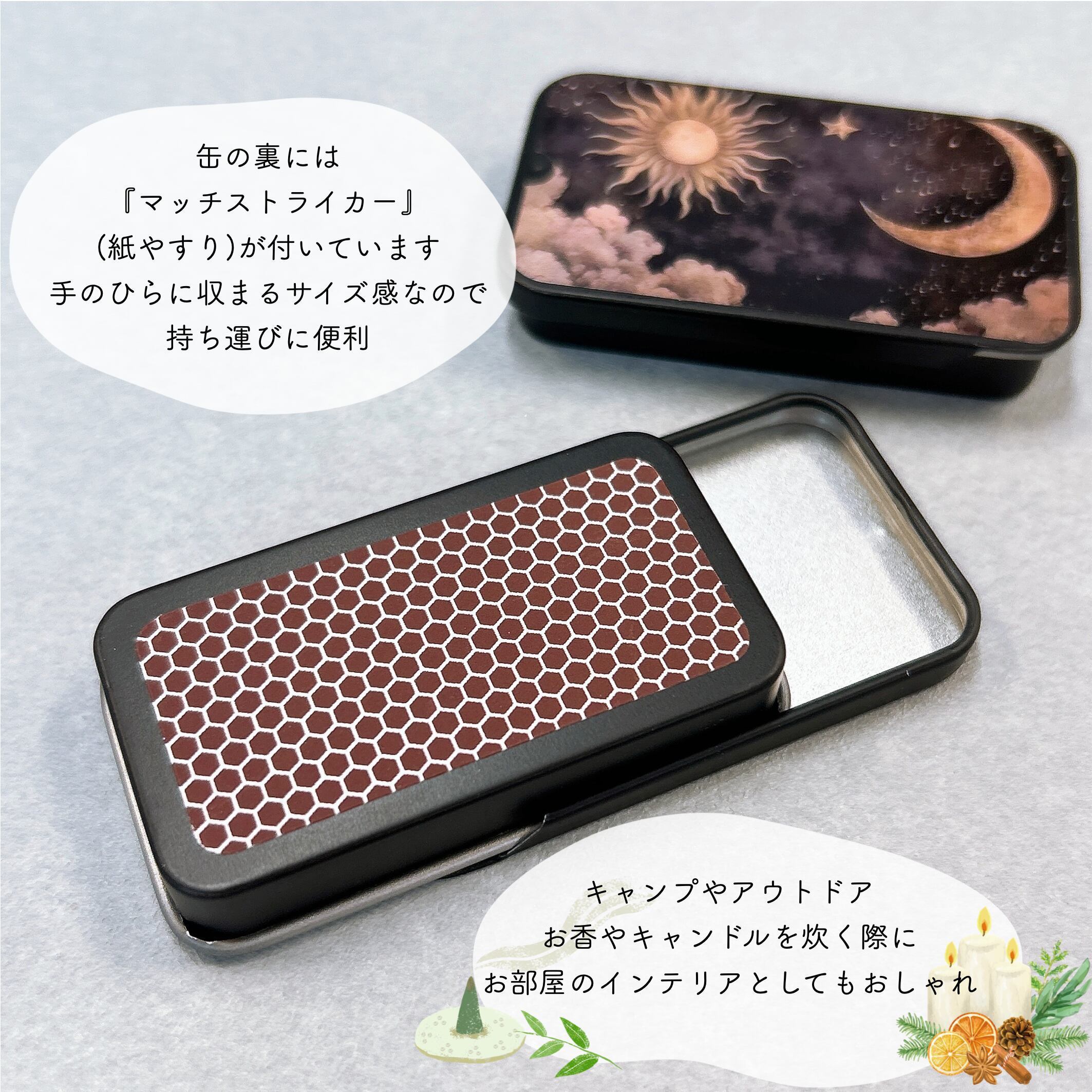 【 月 と 太陽 マッチ 缶 】1個 ブラック スライド式 タブレット ブリキ缶 マッチストライカー付き アウトドア キャンプ 焚き火 お香 線香 キャンドル 喫煙 タバコ ピルケース サプリメント キャンディケース 小物入れ 携帯用 コンテナ 薄型 収納 ケース おしゃれ