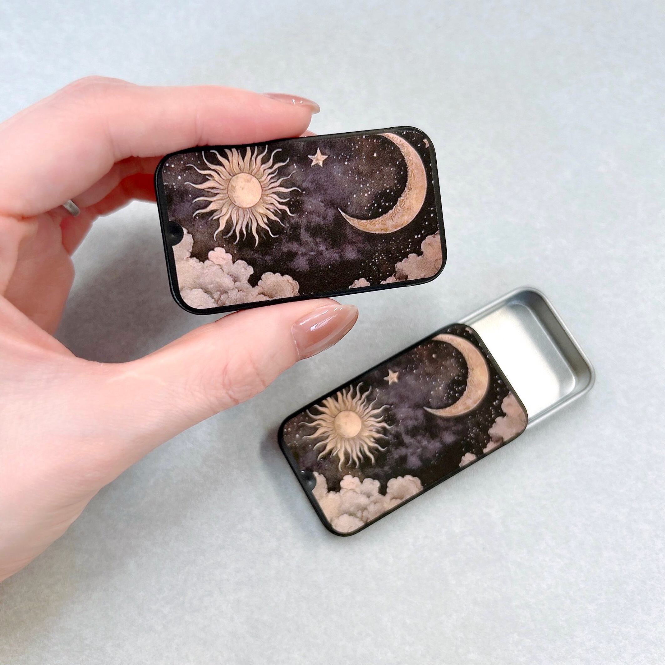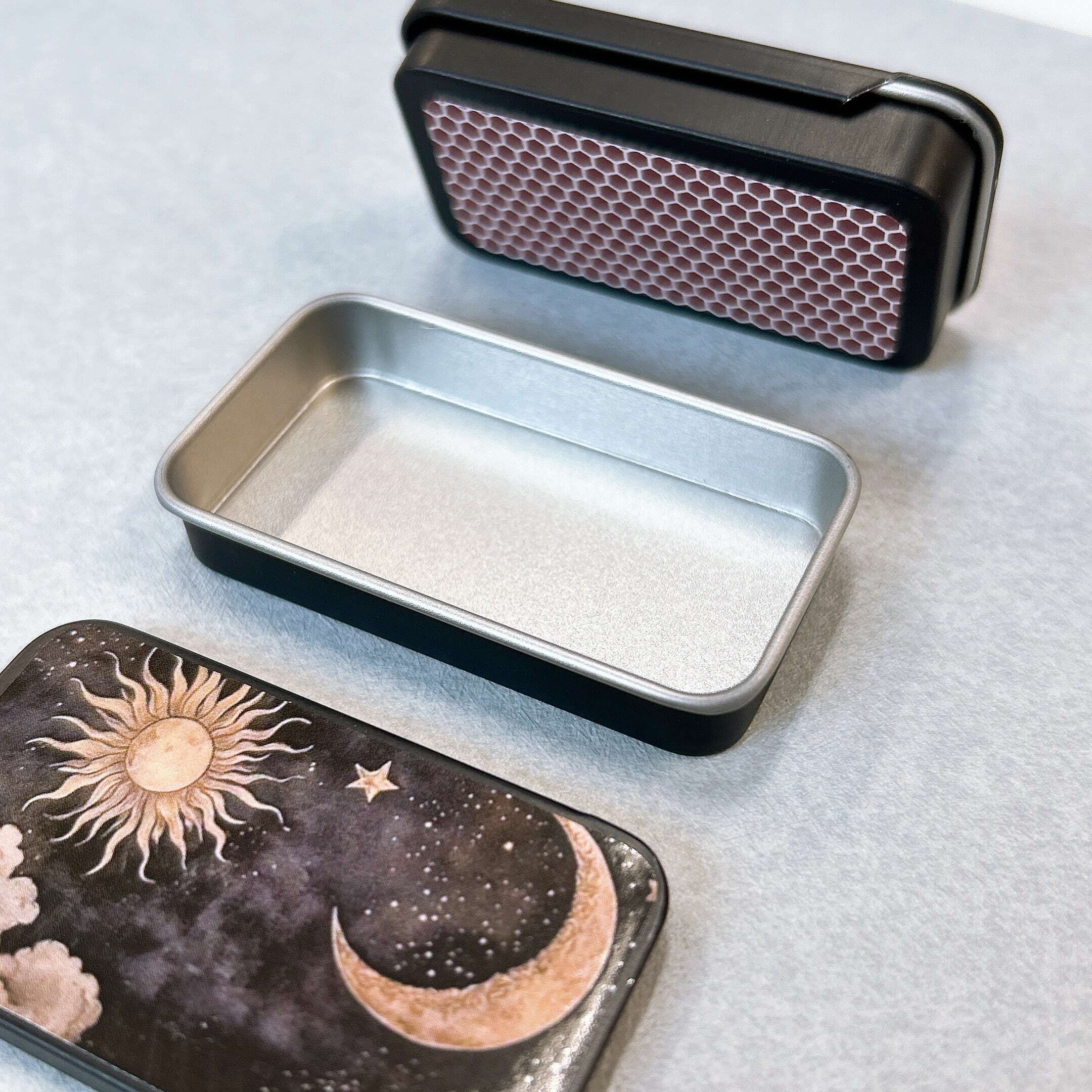 幻想的な月と太陽デザインされたスライド式マッチケースです。