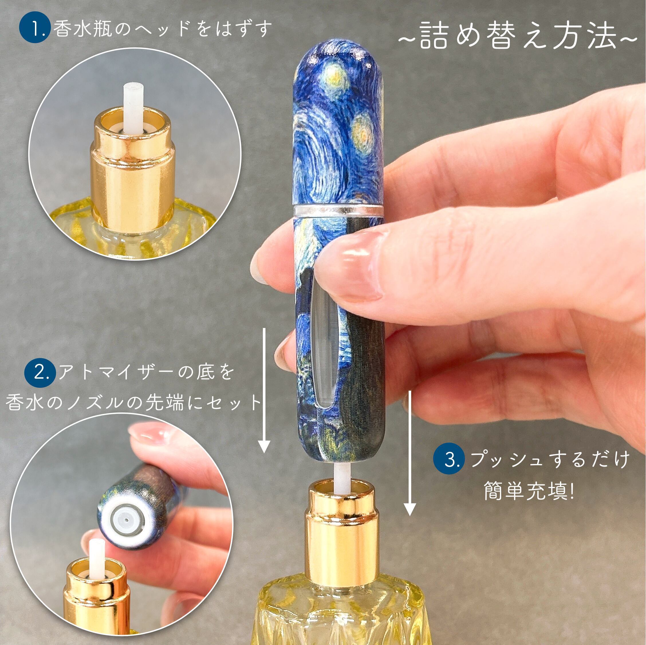 【ゴッホ 星月夜 香水 アトマイザー 5ml】1本 クイックチャージ式 簡単 スプレー ボトル 底部充填式 残量が分かる フレグランス 詰替 容器 上品 高級 大人 携帯 持ち運び 旅行 軽量 スリム コンパクト 手作り ミスト ハンドメイド ギフト プレゼント アート 絵 名画 油絵 絵画 画廊 ギャラリー 作品 芸術 美術 美術館 ポスト印象派 おしゃれ