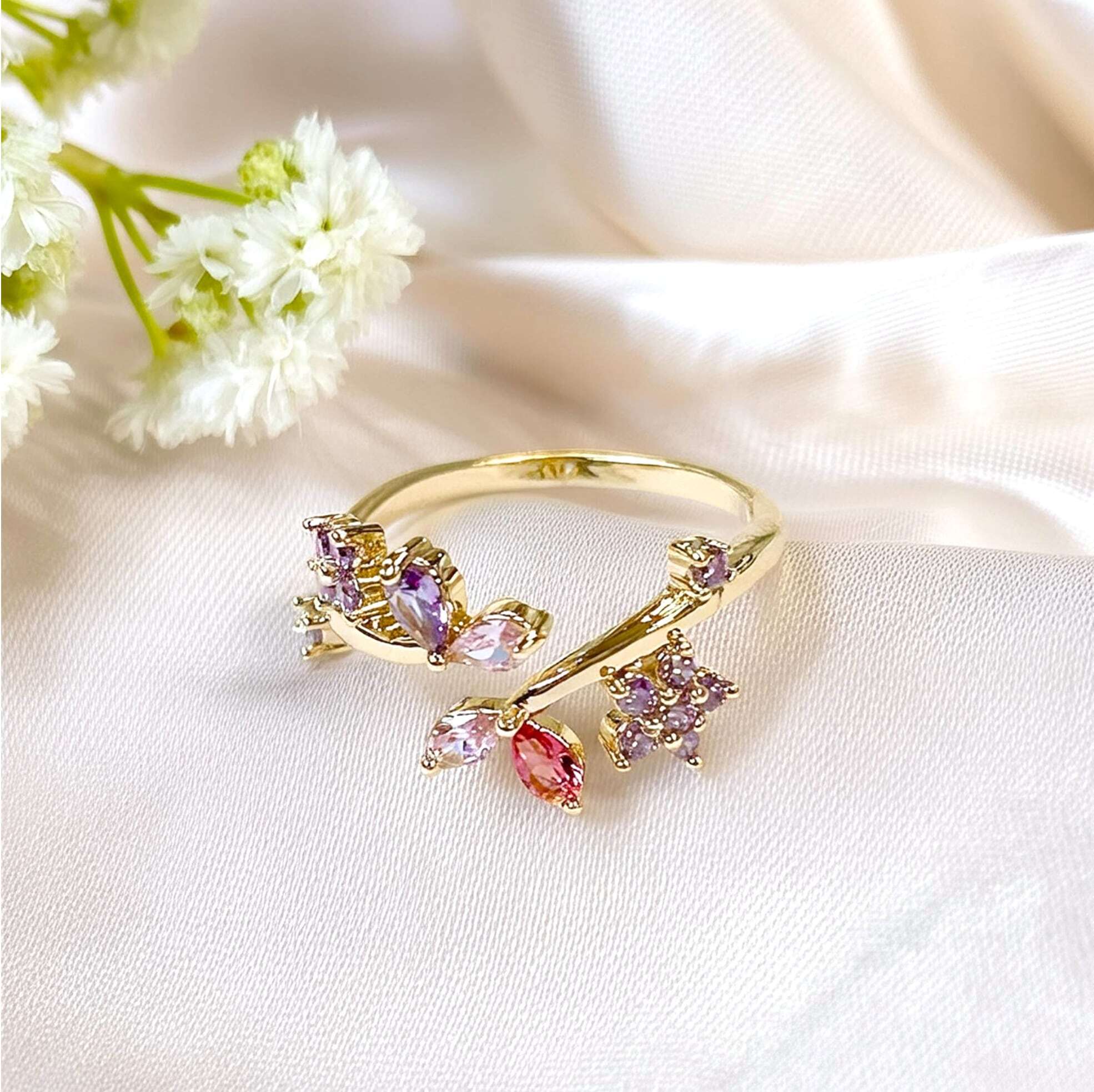 【 ピンク パープル フラワー ストーン ゴールド リング 】フラワーモチーフ オープンリング ラインストーン キラキラ 指輪 調整可能 フリーサイズ シンプル アクセサリー ジュエリー ファッション 小物 プレゼント ギフト ご褒美 自分用 普段着 普段使い 通学用 通勤用 旅行 パーティー イベント デート ディナー おしゃれ かわいい