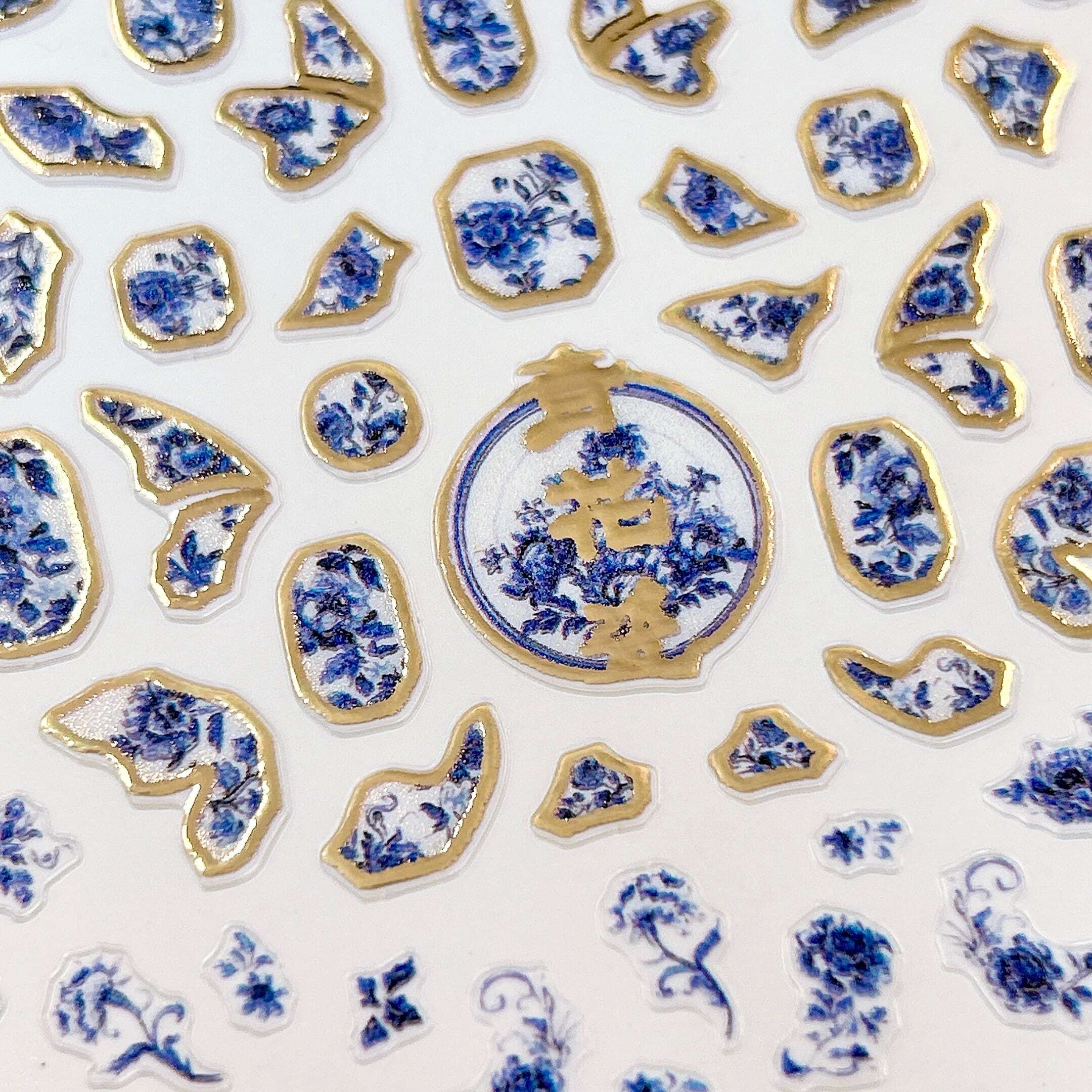 【 ネイル シール 】 青花 陶器風 シノワズリ 陶磁器 伝統 ゴールド ネイルアート ジェルネイル 生活 自然 可愛い 美容 手 爪 デート 女 男 手紙 便箋 スタンプ エンボス 3D 立体 ぷく ぷっくり ステッカー おしゃれ 結婚式 招待状 ラッピング プレゼント カード シール交換 シール帳