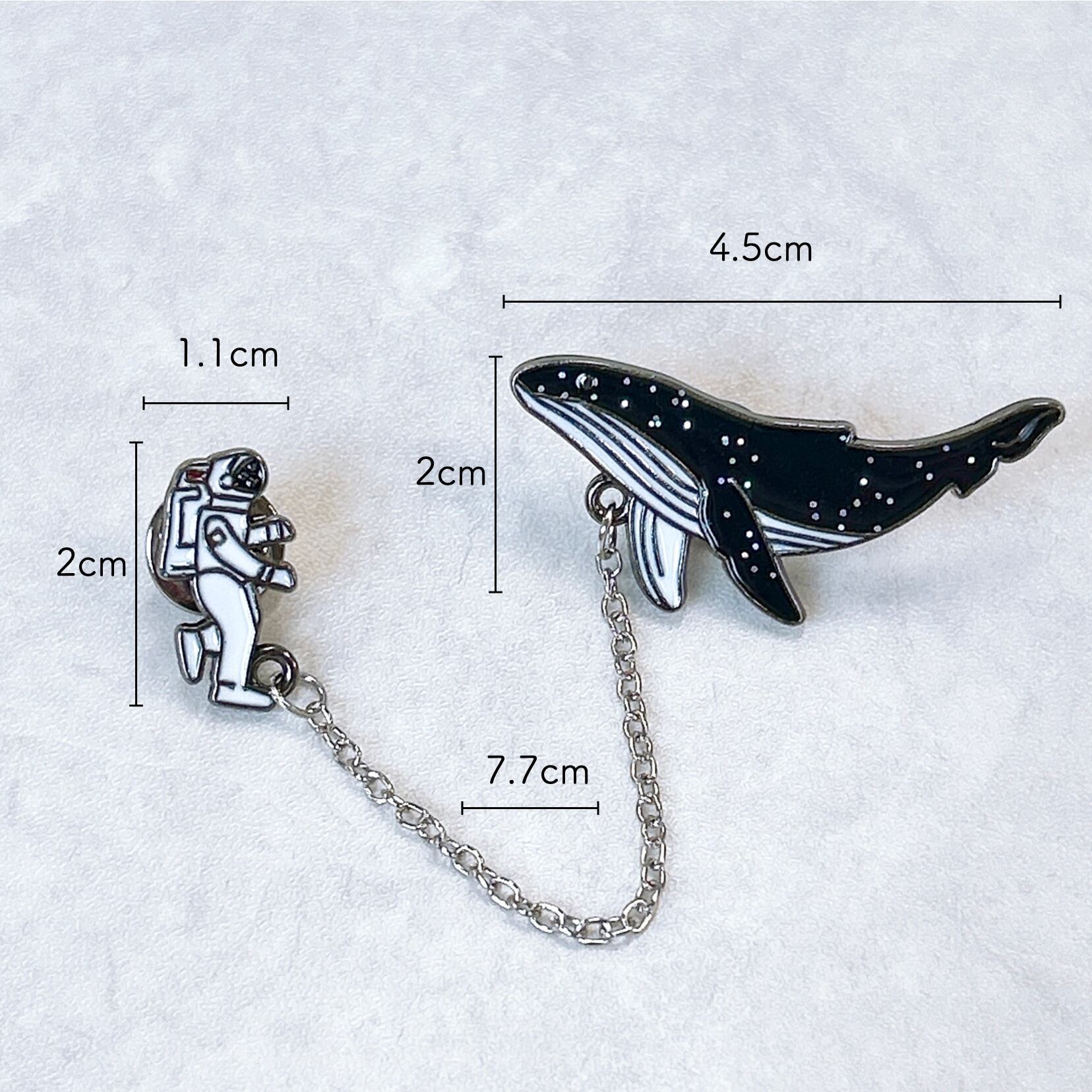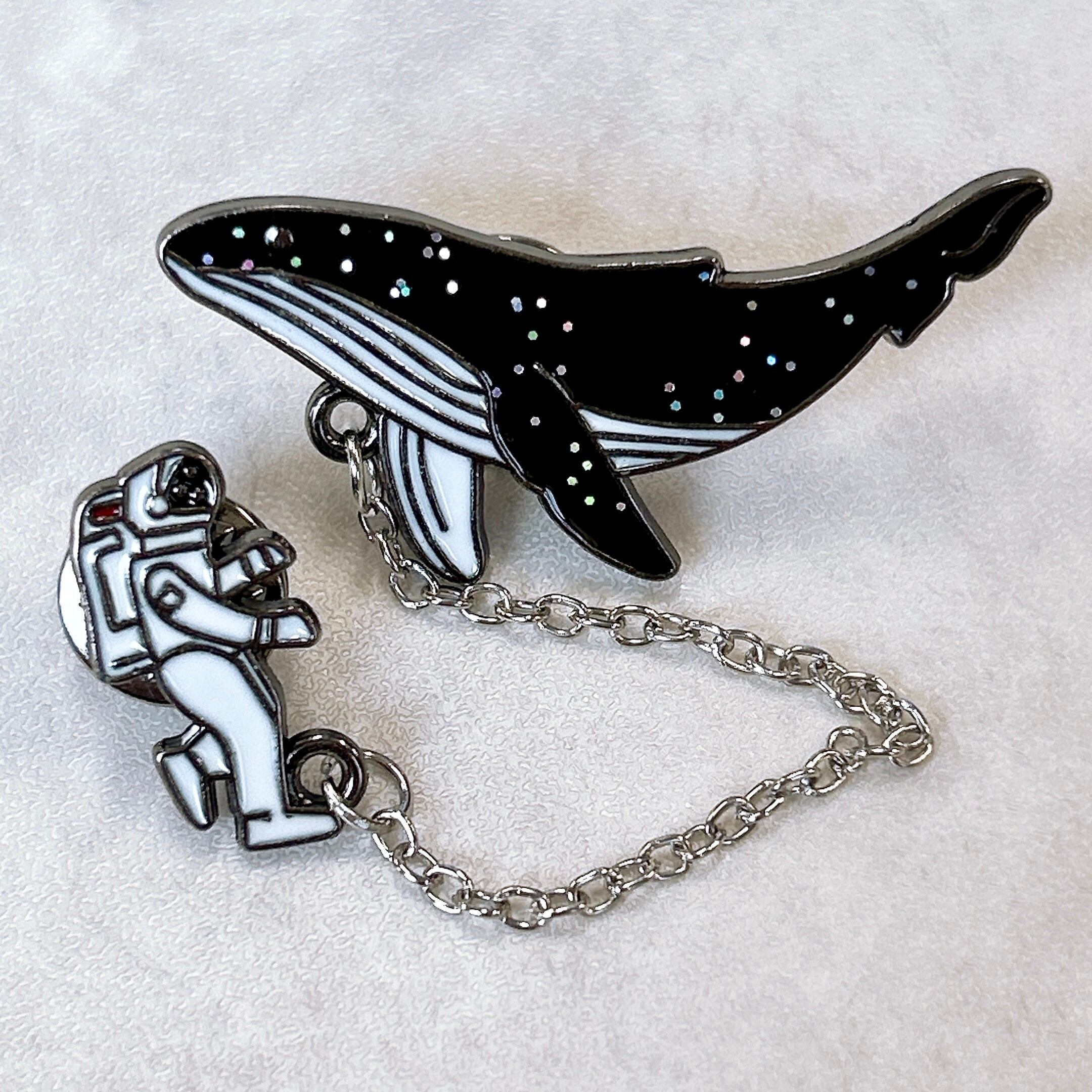 【 クジラ と 宇宙飛行士 ピンバッジ 】チェーン付き シルバー チェーンピンバッジ 揺れる ラメ キラキラ 浮遊 宇宙 シロナガスクジラ 鯨 くじら モノトーン シック イベント ピンブローチ 胸飾り 装飾ピン アクセサリー ファッション 小物 ワンポイント レディース ギフト プレゼント おしゃれ 雑貨 アクセント かわいい 可愛い