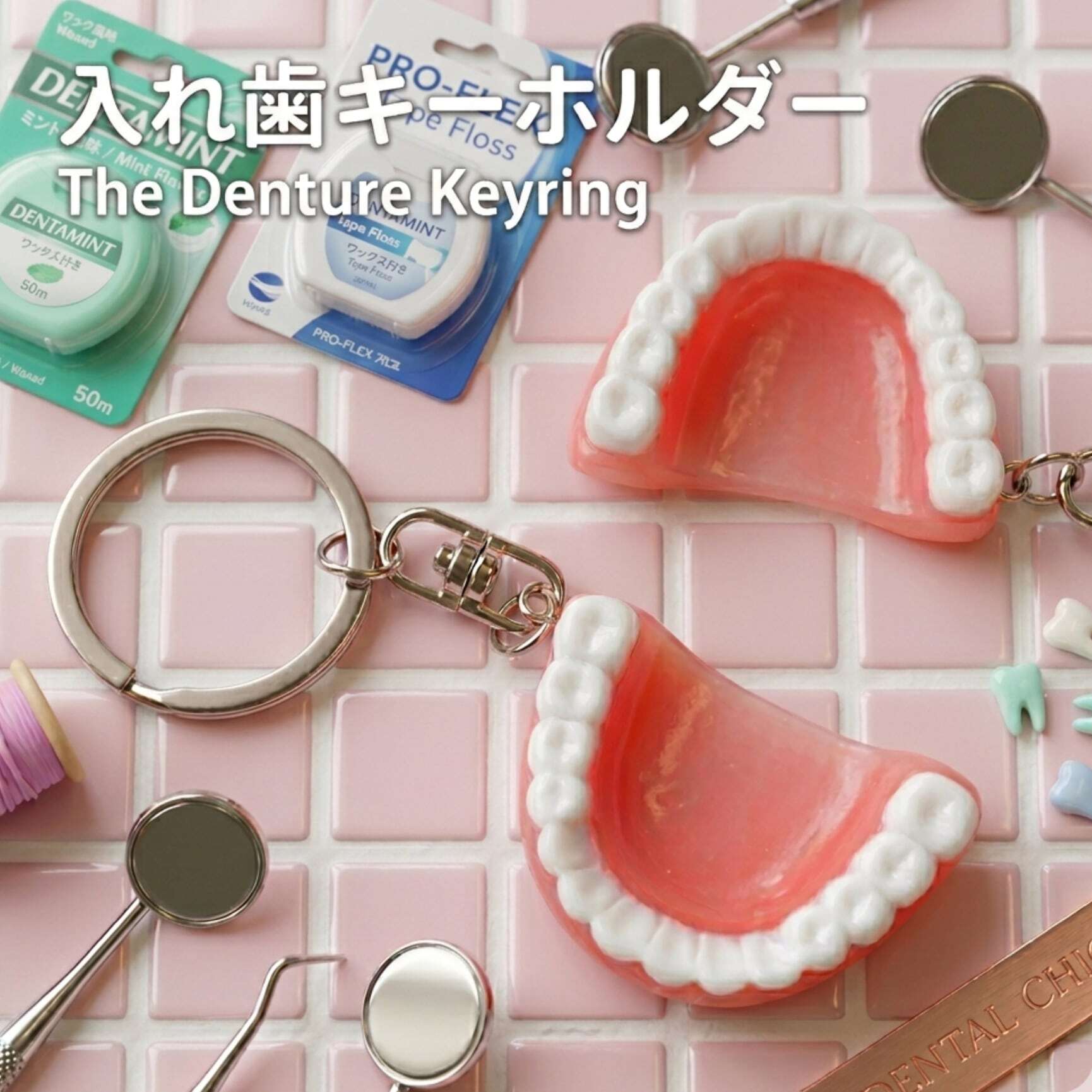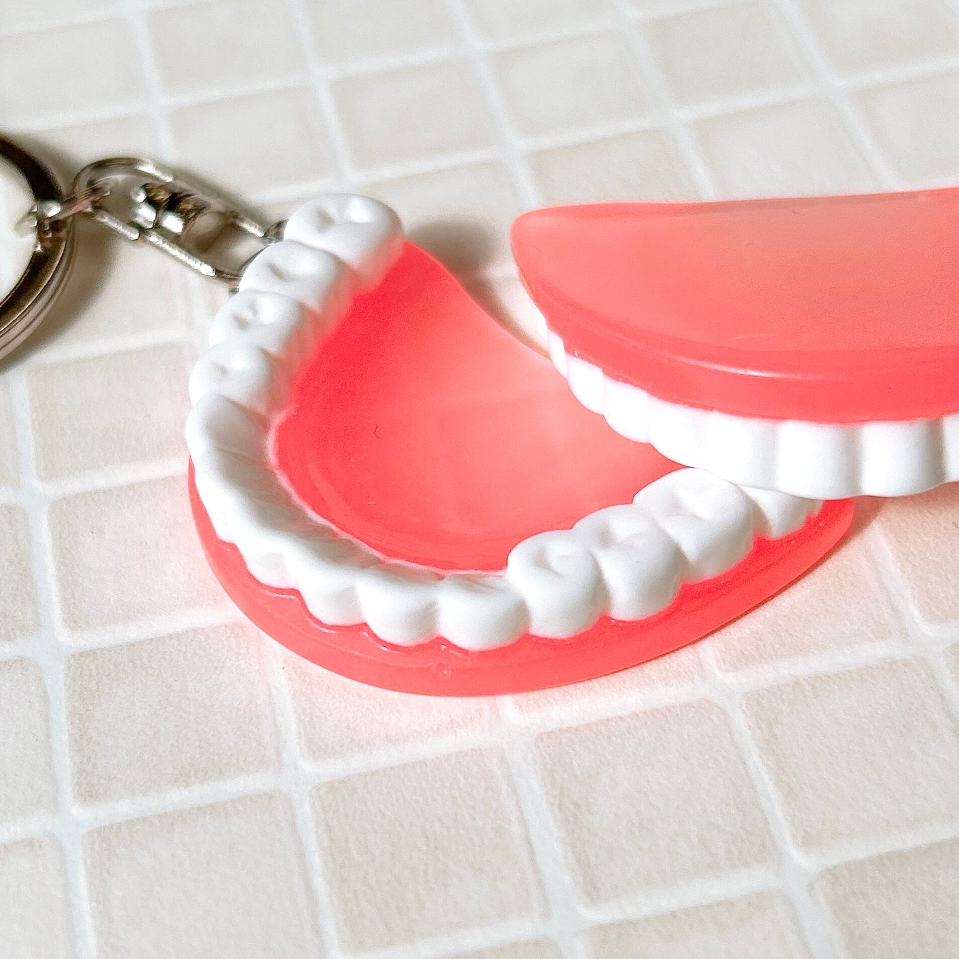 愛らしいピンク色の入れ歯をモチーフにしたユニークなキーホルダーです。